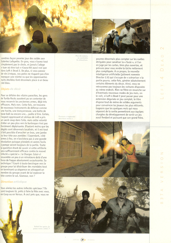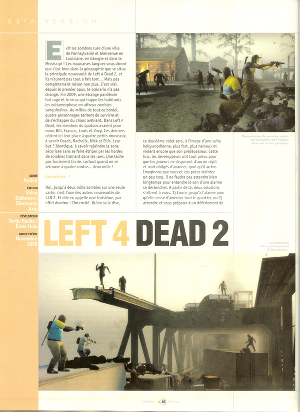 La vidéo HD qui va avec : TeaserSteam a écrit :Left 4 Dead 2, la suite du best seller acclamé par la critique qui a repoussé les frontières des jeux de coopération. Prévu pour novembre 2007 ce titre va introduire le genre de combat corps à corps et approfondir l'expérience de coopération en vous fournissant de nouvelles armes telles que la poêle à frire, la tronçonneuse, la batte ou encore la hache. Nouveaux personnages principaux, nouvelles armes et nouveaux objets, Left 4 Dead 2 est plus vaste que l'original avec de nouvelles campagnes, de nouvelles cartes en mode versus et en mode survie. Left 4 Dead 2 est prévu pour sortir le 17 novembre 2009 sur PC comme sur Xbox 360.